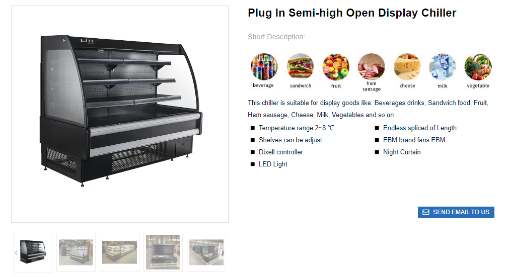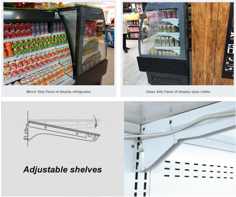 This chiller is suitable for display goods like: Beverages drinks, Sandwich food, Fruit, Ham sausage, Cheese, Milk, Vegetables and so on.
