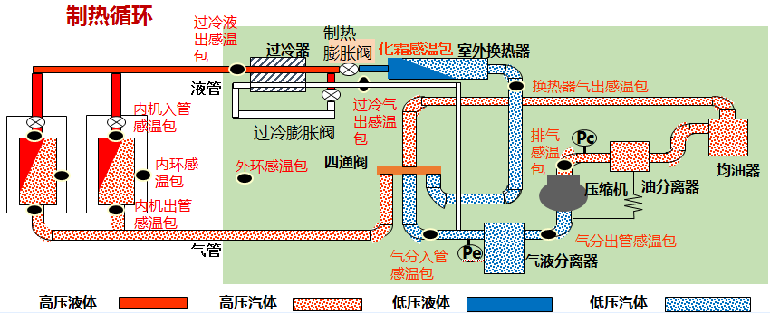The principle of heating is basically the same as that of refrigeration, the difference is that the valve block in the electromagnetic four-way valve is controlled by the circuit system to change direction, thereby changing the flow direction of the refrigerant and realizing the conversion from cooling to heating.
