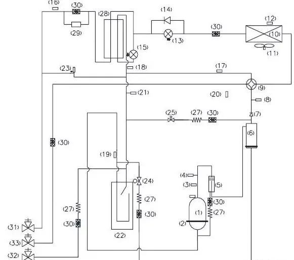 Gas-liquid separator (22): The main function of the gas-liquid separator is to store part of the refrigerant in the system to prevent the compressor from liquid shock and excessive refrigerant from diluting the compressor oil.