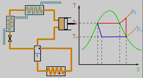 Main devices: refrigeration compressor, condenser, expansion valve, evaporator.