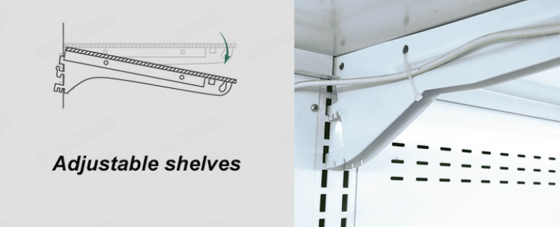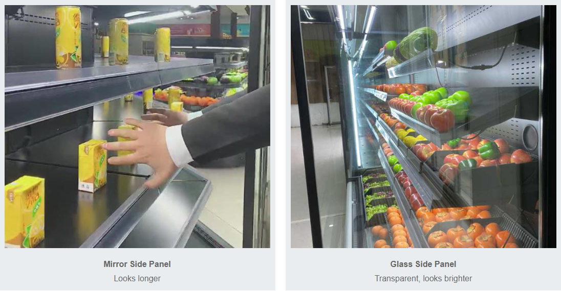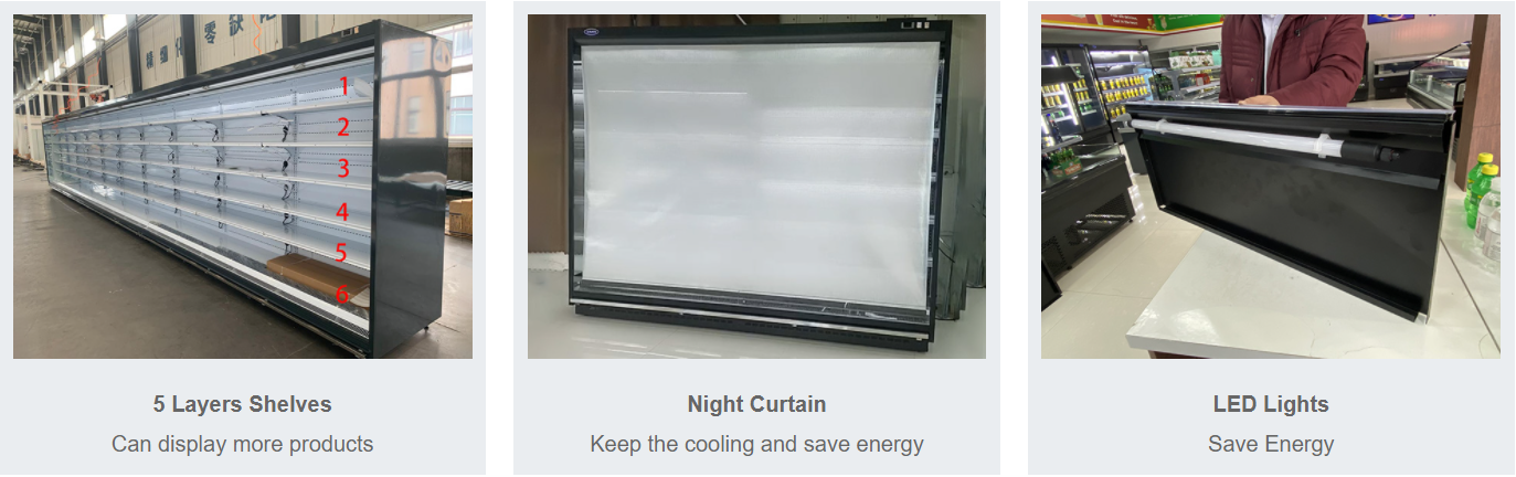 The display open chiller has 2 types, one is with compressor inside, plug in type, very easy to use and move to everywhere, it is very suitable for small supermarket and convenience stores. Another type is to put the compressor outside and connect with copper tubes, it suitable for big supermarket and it can combined more longer can display more products. Both of them has the night curtains which can pull down when at night, it can effective to keep the cooling and save energy, there are led light with every layer shelves, can bright every corner in the open chiller, the side panel can be customized with hollow type and mirror type, the hollow type can make our open chiller seems more bright and customer can easy to see what are on sale on the shelves, another one mirror type, it can seems more longer, especially when the open chiller near the wall.