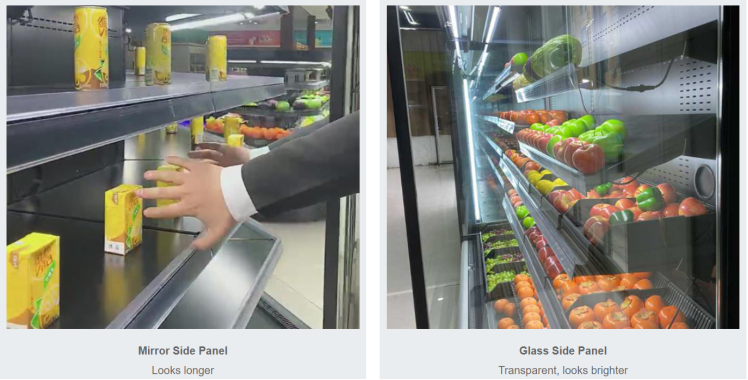 5. The side panel can be made of insulating glass or mirror glass, mirror glass can make your display chiller look longer